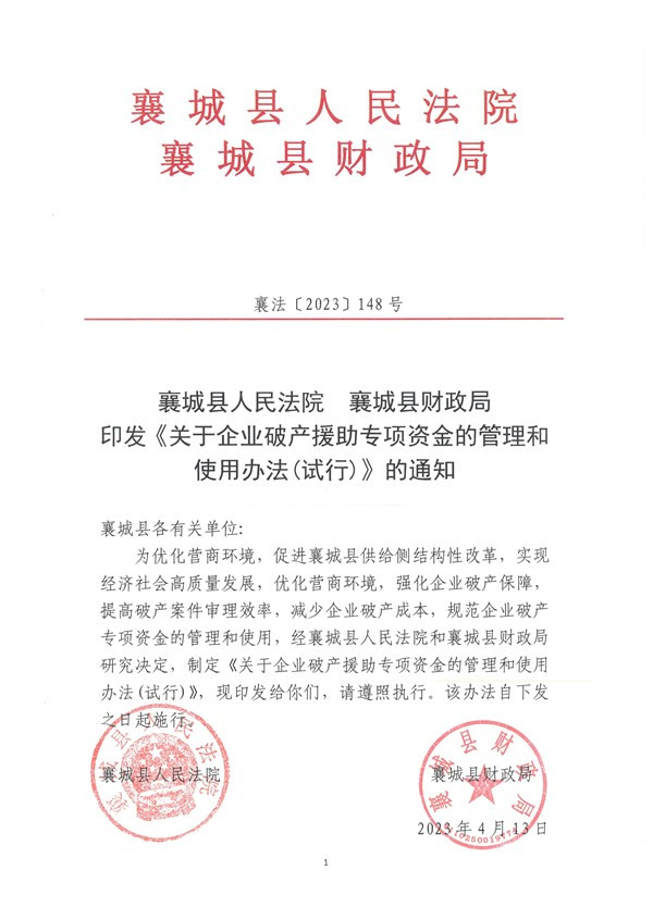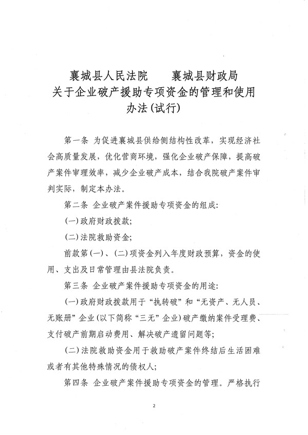 襄城县人民法院襄城县财政局 关于企业破产援助专项资金的管理和使用办法