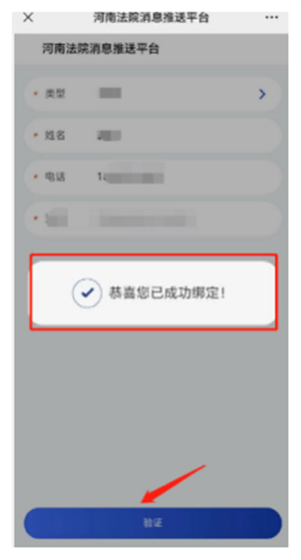 填写个人信息并点击验证,验证成功后出现成功绑定提示