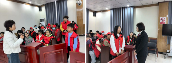 “法庭为什么要挂国徽呢?”“如果证人的证言不是真的,怎么办?”模拟庭审结束后,面对孩子们的一个个问题,审判委员会专职委员王丽霞、城关法庭庭长万方芳为大家带来了一堂生动的普法课堂,用通俗易懂的语言解读孩子们提出的问题,在寓教于乐中把严肃的法律知识变得有趣易懂。