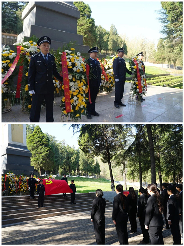 走出纪念馆,干警们来到巍峨的革命烈士纪念碑前。全体干警整齐列队,全场肃立。四名法警稳稳抬起花篮,迈着礼步缓缓走向纪念碑,将花篮摆放在碑前。全体干警向革命先烈三鞠躬,默哀致敬,表达对英烈的深切缅怀和崇高敬意。